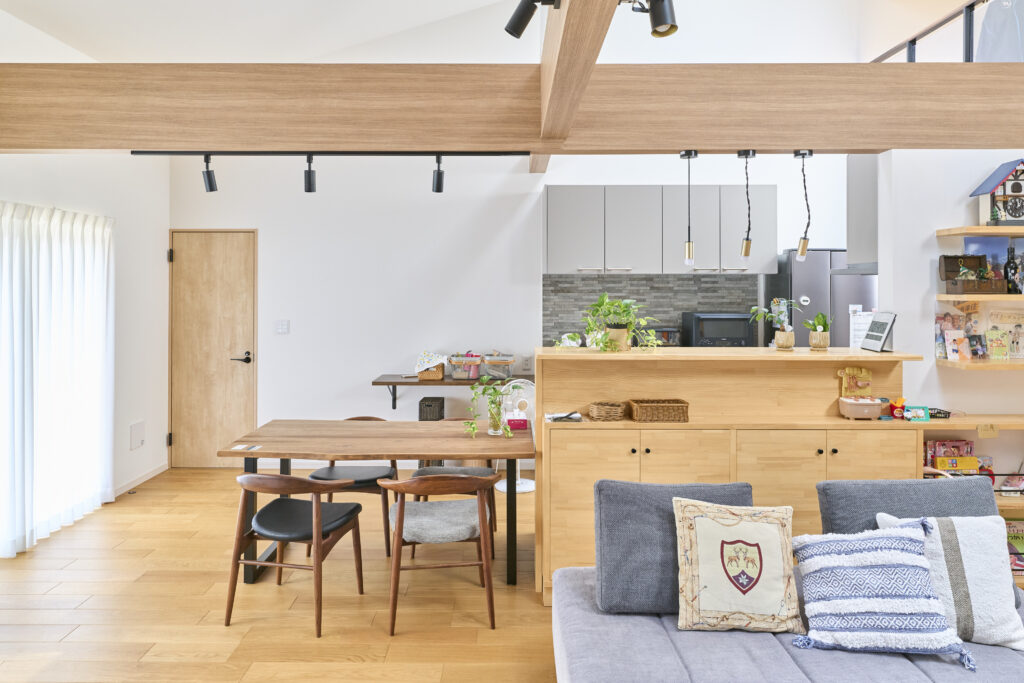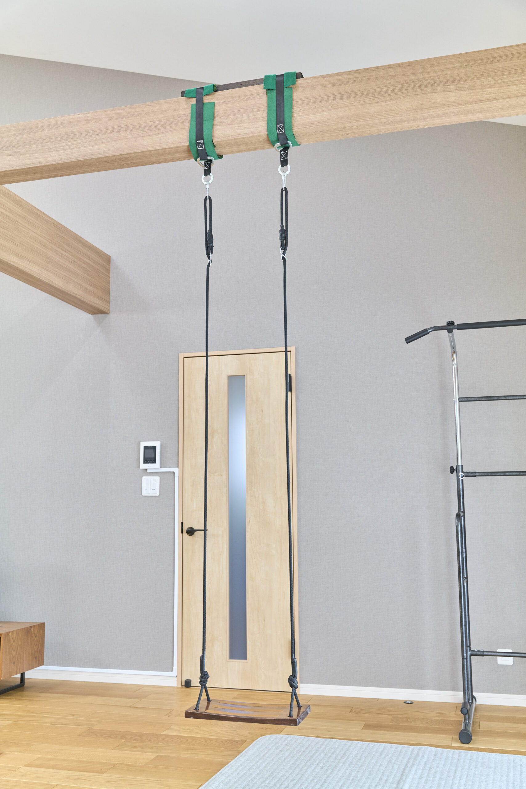 会話を重ねていく中で、「リビングにブランコやハンモックをつけられる大きな梁を」というご希望をいただき、その梁はご新居の象徴的な存在になりました。
