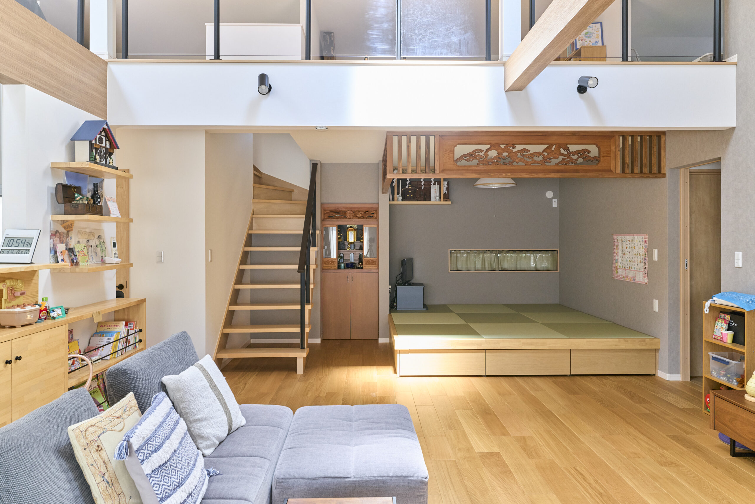 ブランコをつけるためのプラットフォームでもあり、美しく、大きな梁が通ってるリビング。その天井には、大屋根からの光を取り入れる天窓をつけ、自然光が行き渡る設計にしました。また、リビングの一画に和室コーナーを設け、欄間を活用。欄間についてる歴史ある家紋は、古いお家から新しいお家をつなぐ素敵なアイコンにもなっています。
